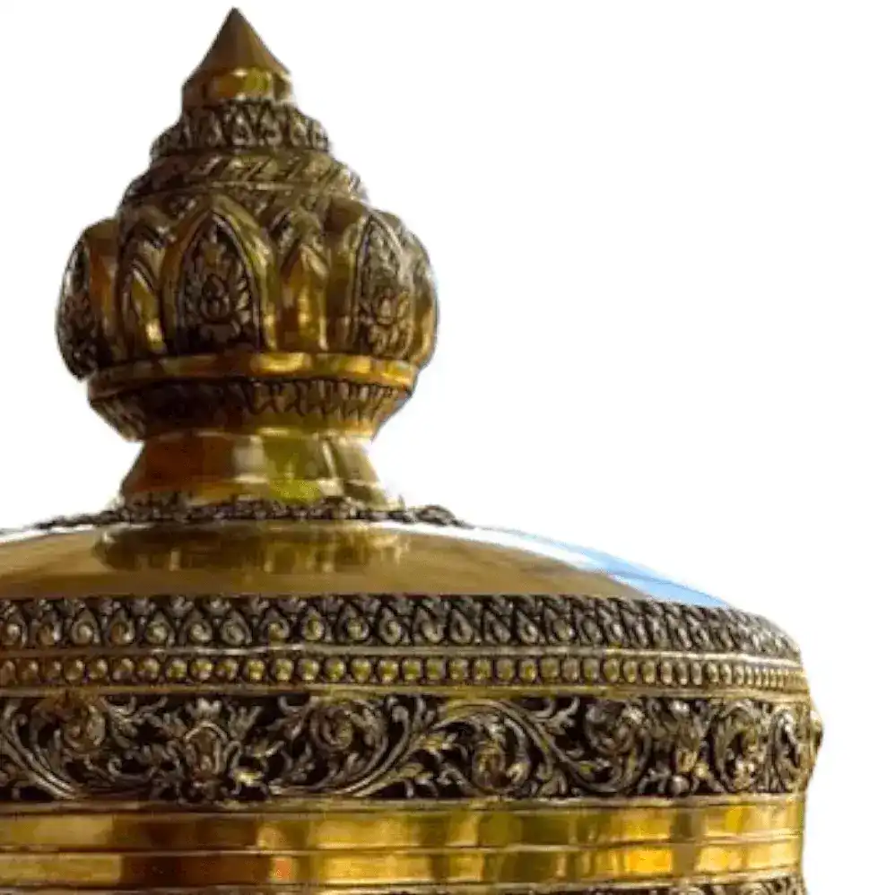 Particularly, this intricately-engraved brass bowl with a lotus-shaped lid features engraved flora and foliate decoration. Each piece requires complicated engraving by hand for 6 months before birthing a highly detailed nielloware. It is such an exceptional example of Southeast Asian niello works, making it a perfect heirloom for your beloved family.