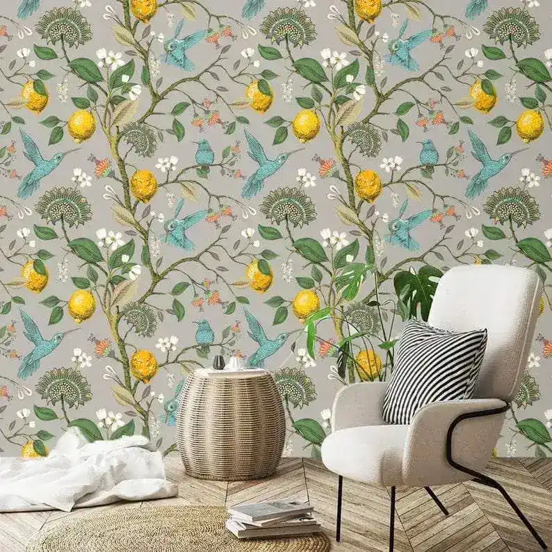 Gray Vintage Hummingbird Chinese Style Birds Tree Branch Wallpaper