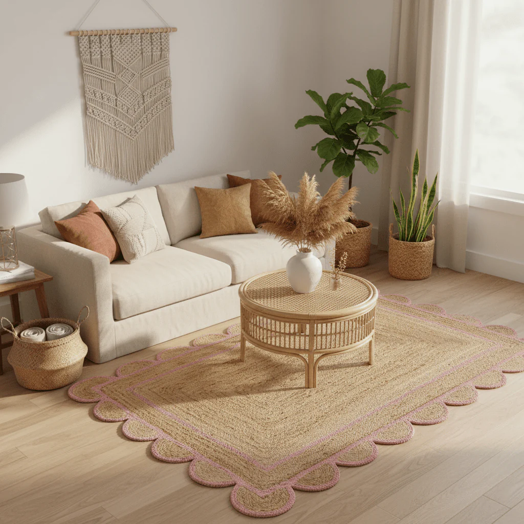 This Handmade Pink Scalloped Jute Rug is kid and pet friendly, making it suitable for high-traffic areas such as your living room, dining room, kitchen, office, and entryway.