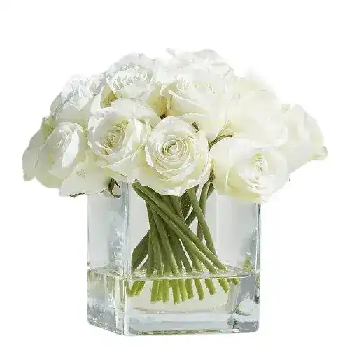 - Best Seller Real Touch Artificial Faux White Silk Rose Centerpiece Arrangement in Fake Water. The arrangement contains fake water in a clear vase. A beautiful delicate statement for every corner of your place.