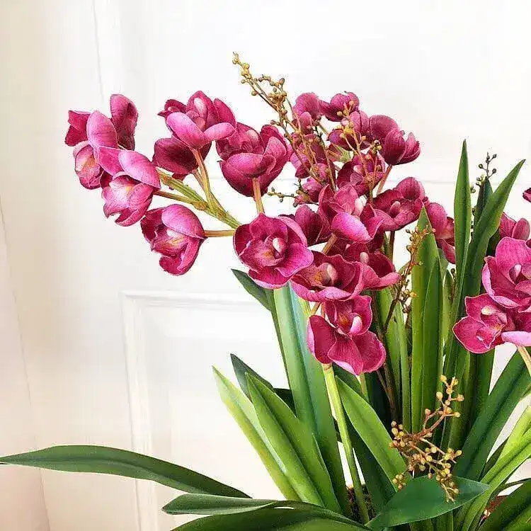 - Real Touch PEVA Purple Cymbidium Orchid arrangement in Golden pot. A beautiful luxury decorative arrangement for Home decor statement.