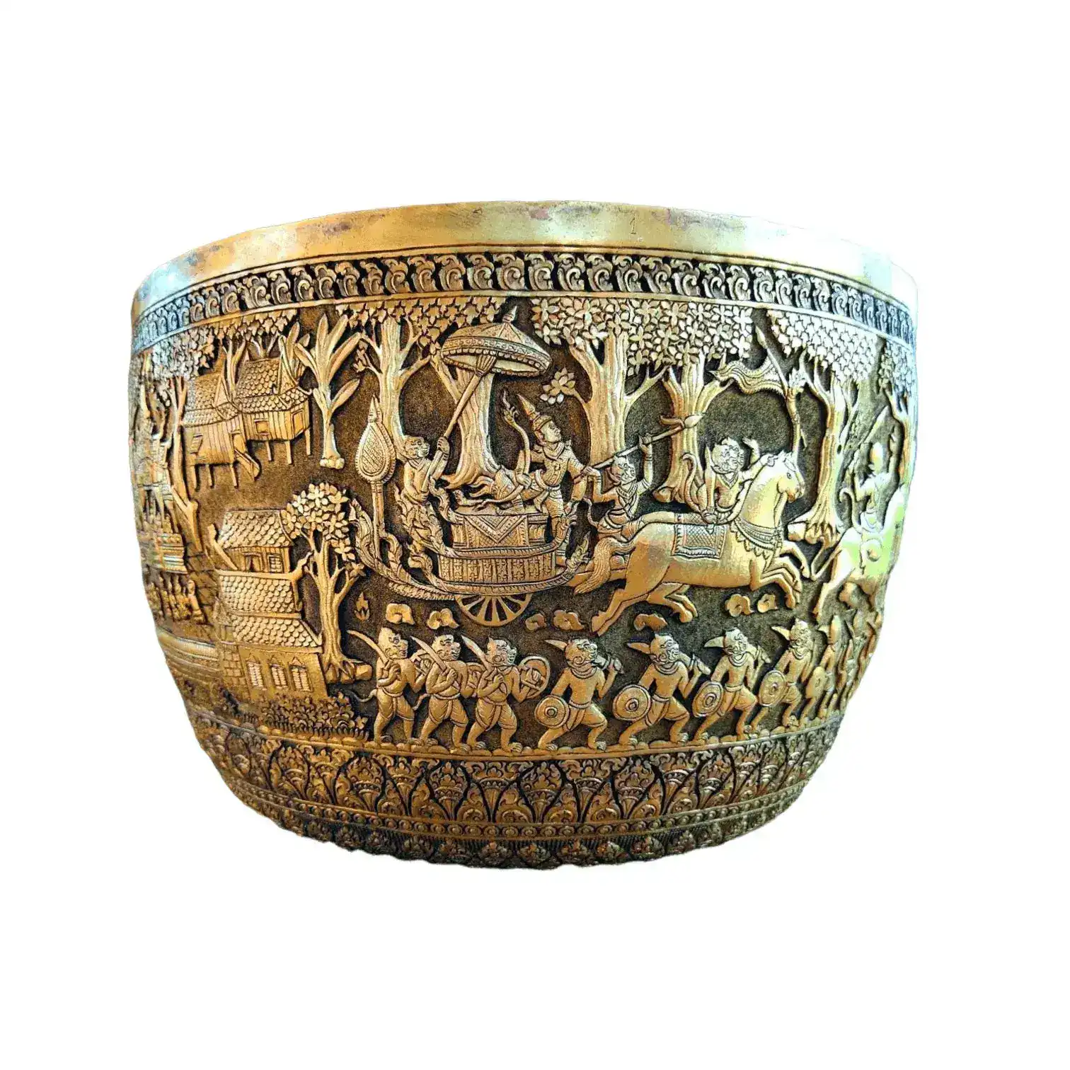Take your decoration to the next level with this highly-collectible Royal Solid Brass Niello Bowl with Lotus Lid. Nielloware has been a status symbol of royalty in many countries in Southeast Asia including Thailand, Myanmar, and Cambodia. The process of creating niello objects is a very labor-intensive and elaborate one. Typically, precious metals such as gold, silver, or brass are incised to create meaning, often culturally, depictions or patterns on an object. Cambodian silversmiths are considered among the most skilled experts at chasing, repoussé, niello, enameling, and gilding such objects.